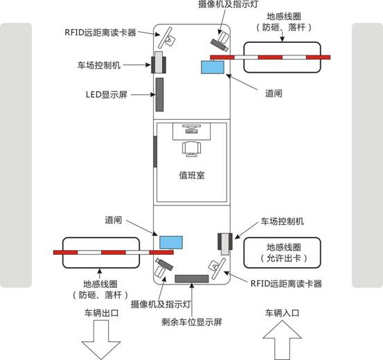 车辆入场时,司机将所持有的本车场IC/ID 卡放在入口控制机的读卡区域前读卡,如果读卡有效,道闸的闸杆自动抬起,允许车辆进入,车辆通过入口处的道闸后,闸杆自动下落,封闭入口车道。